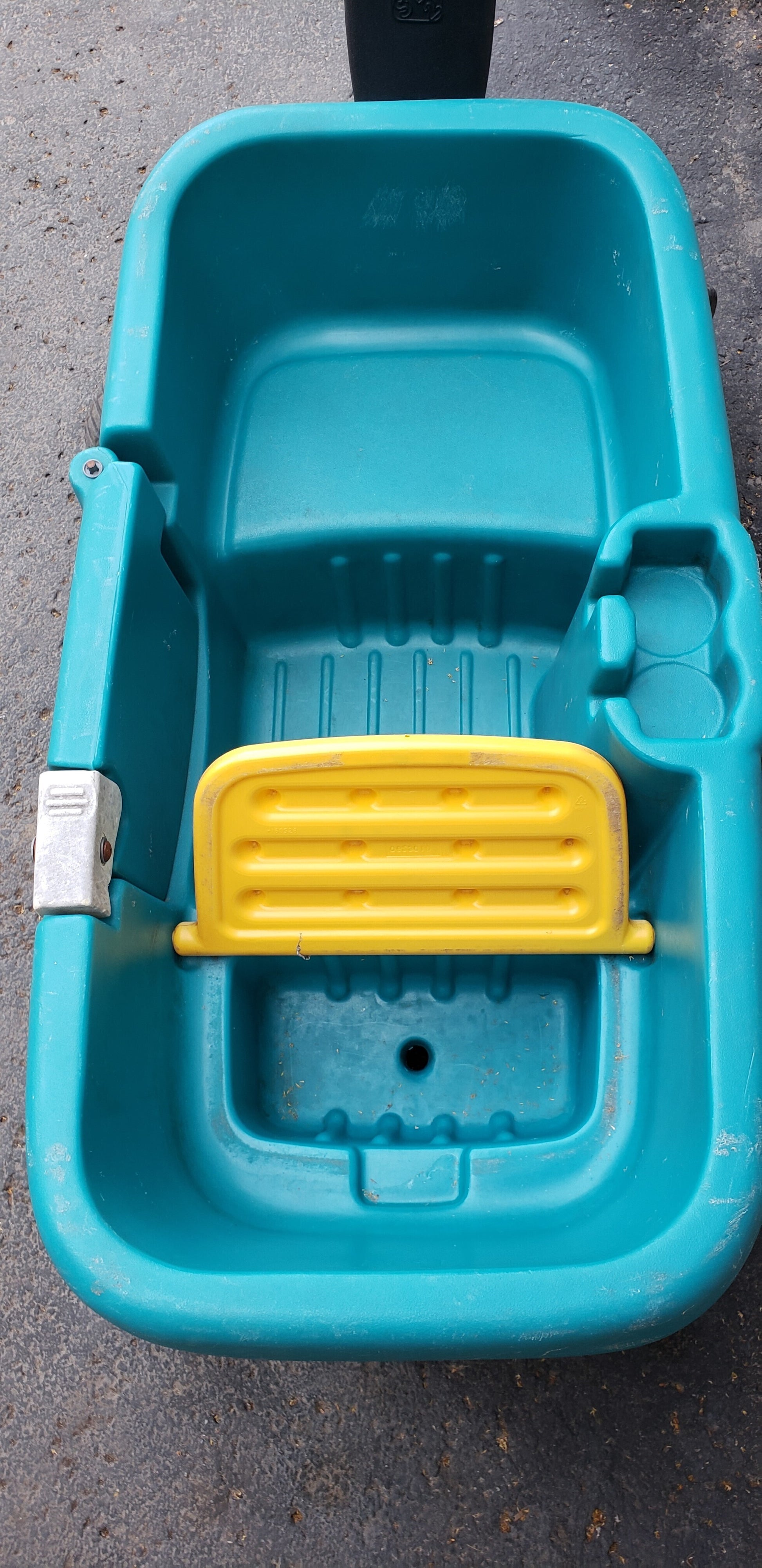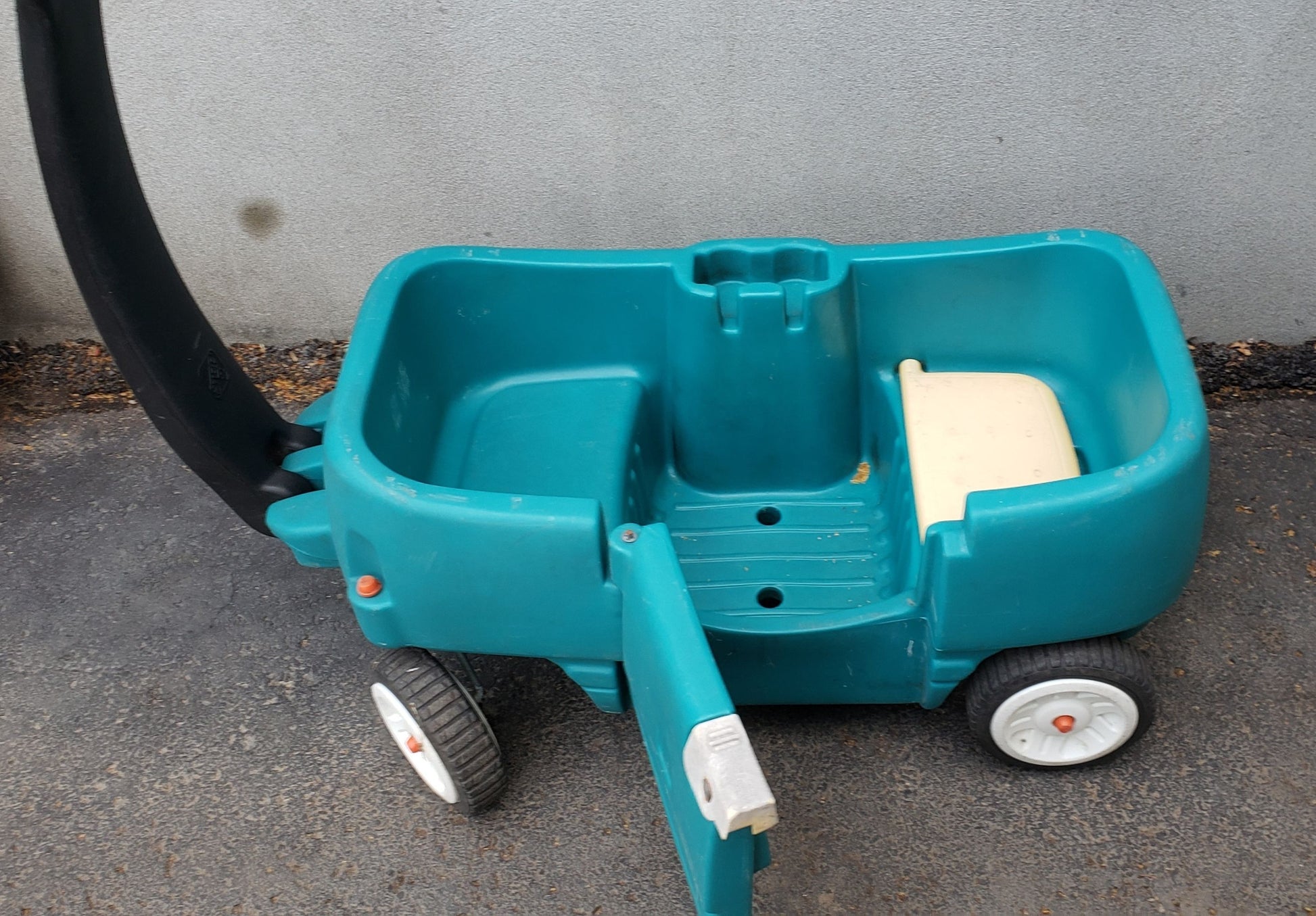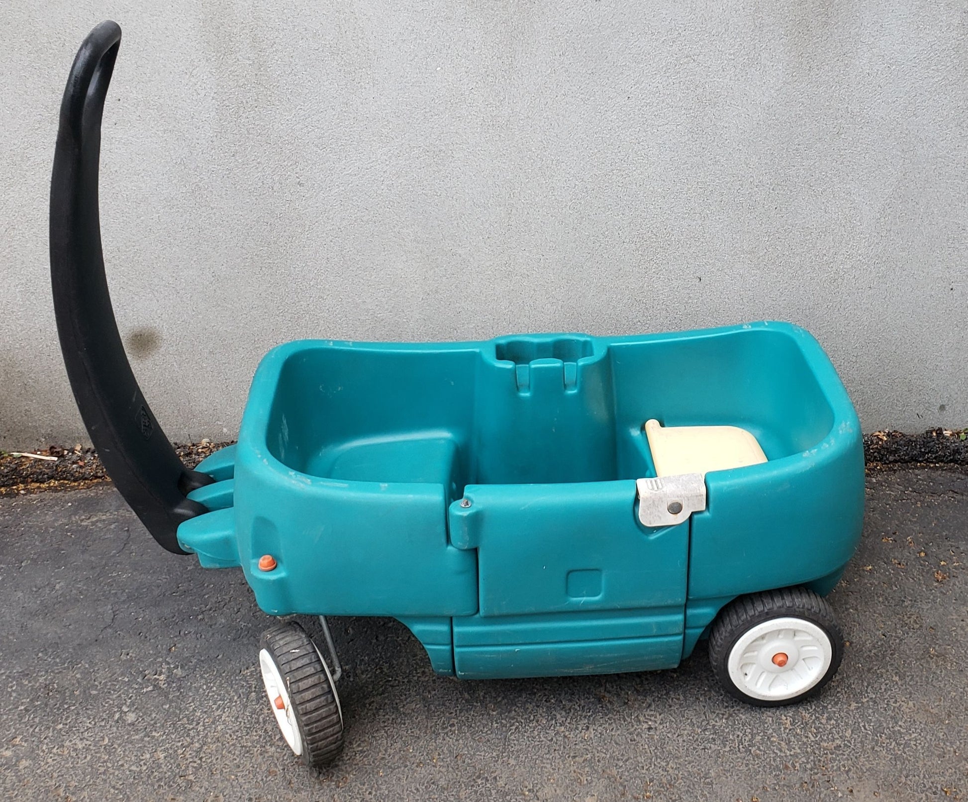 Wagon de marque Step2 avec porte pour faciliter l'embarquement des enfants. Il y a 2 banc. Convient aux enfants entre 18 mois à 5 ans. Poids maximal de 75 lbs. Il y a un peu de rangement sous un banc.