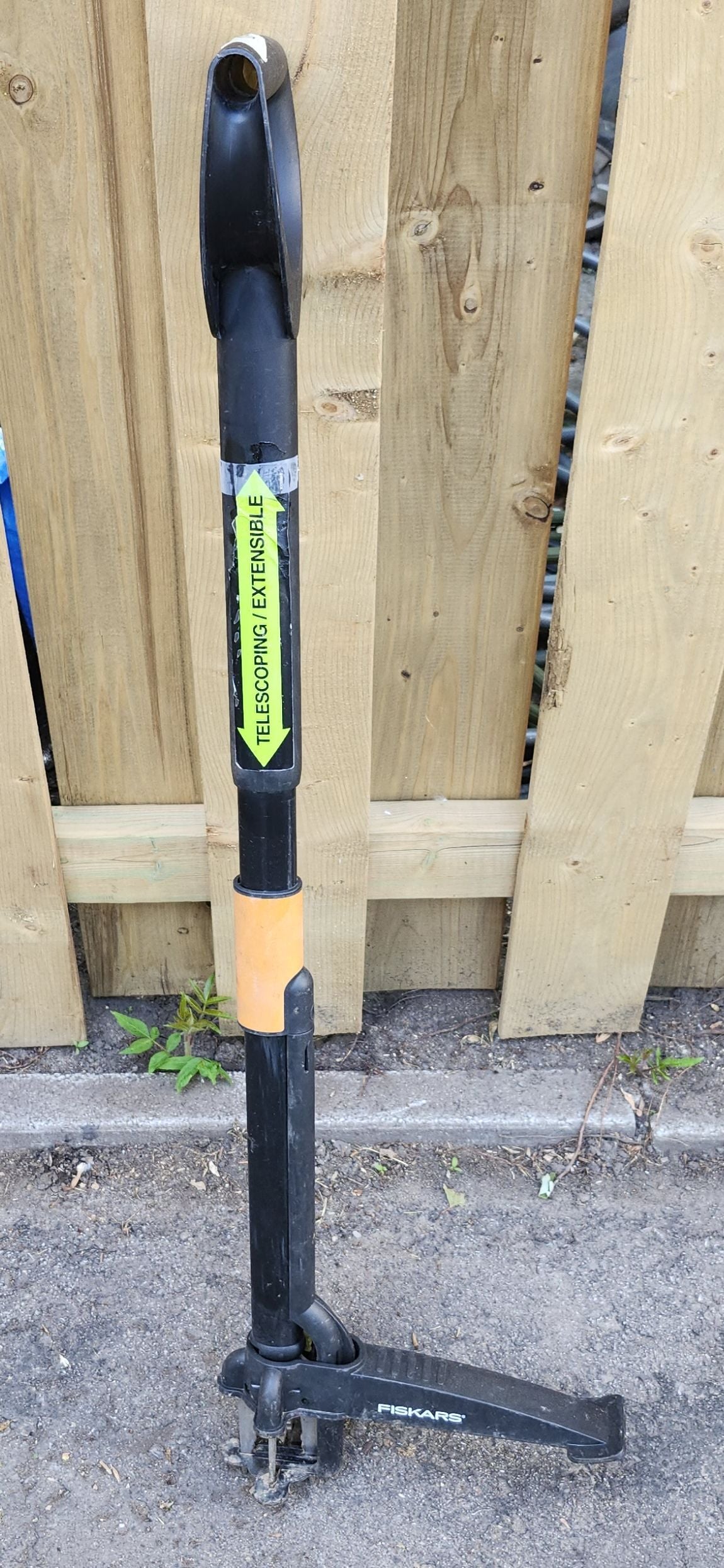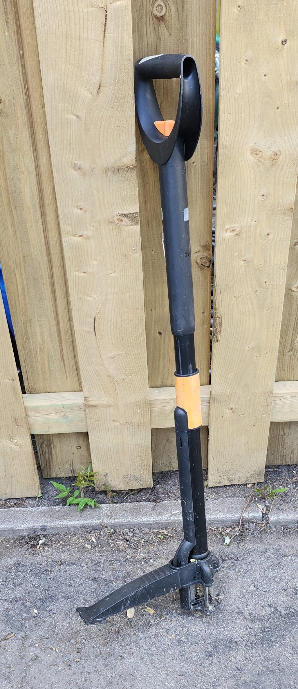 Arrache pissenlit de marque Fiskars. Trois griffes dentelées en acier inoxydable.