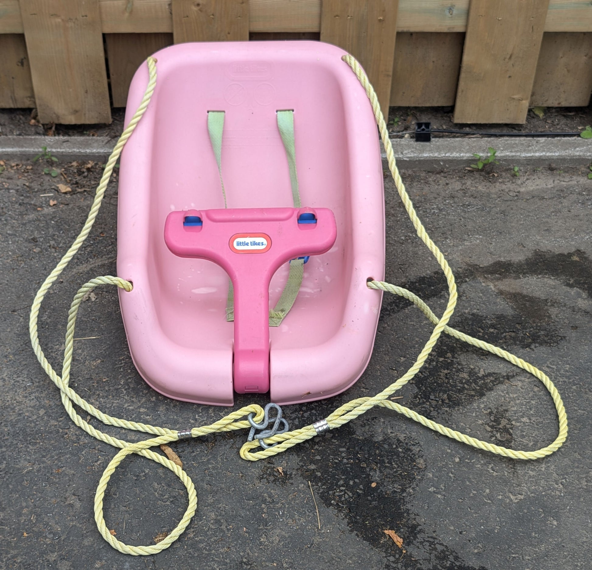 Balançoire pour arbre ou module de marque Little Tikes. Toutes les attaches sont présentes. Conviens aux enfants âgés entre 9 à 48 mois. Poids maximal de 50 lbs.