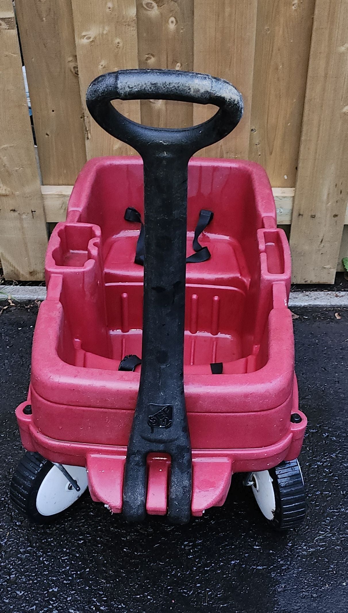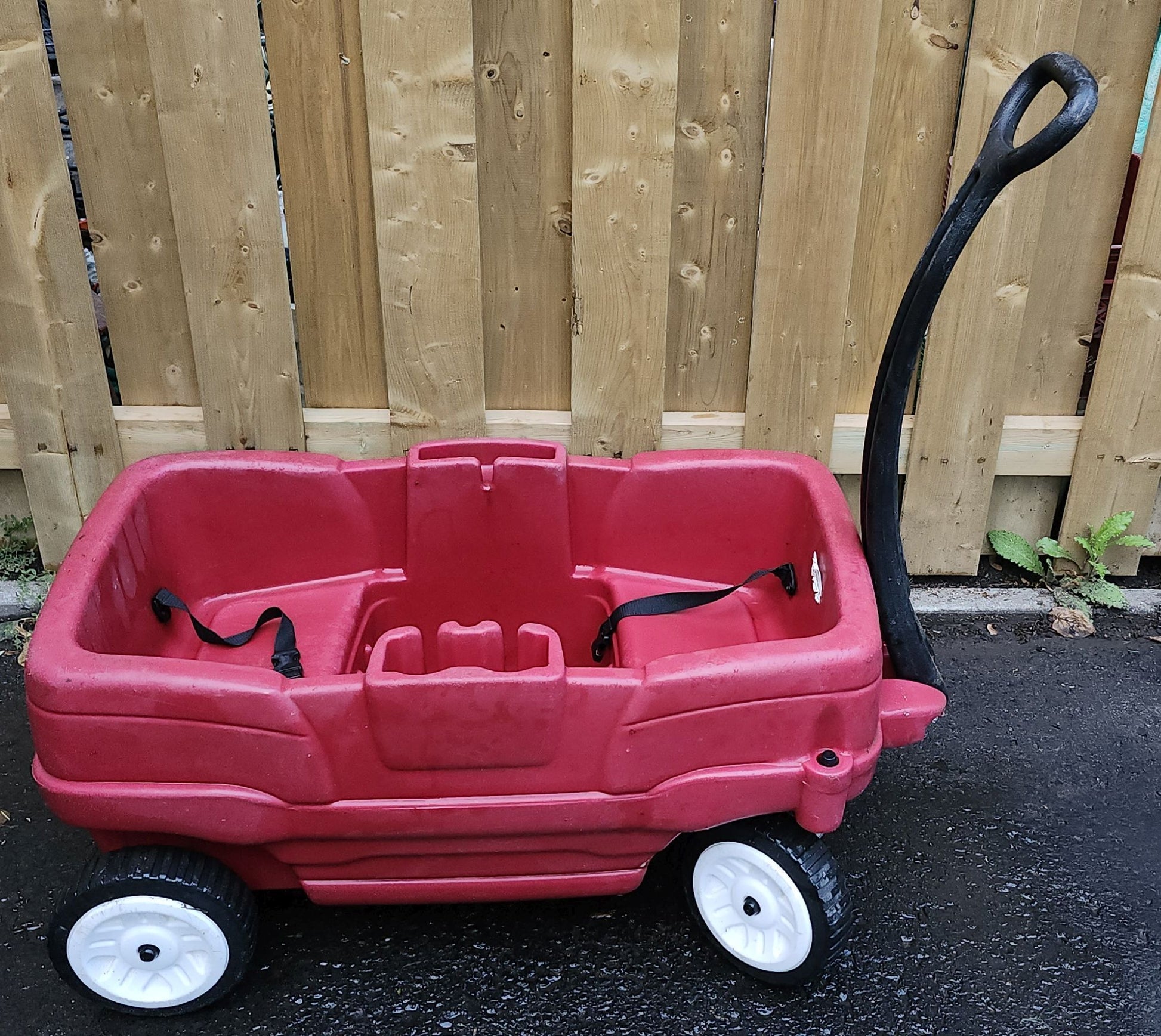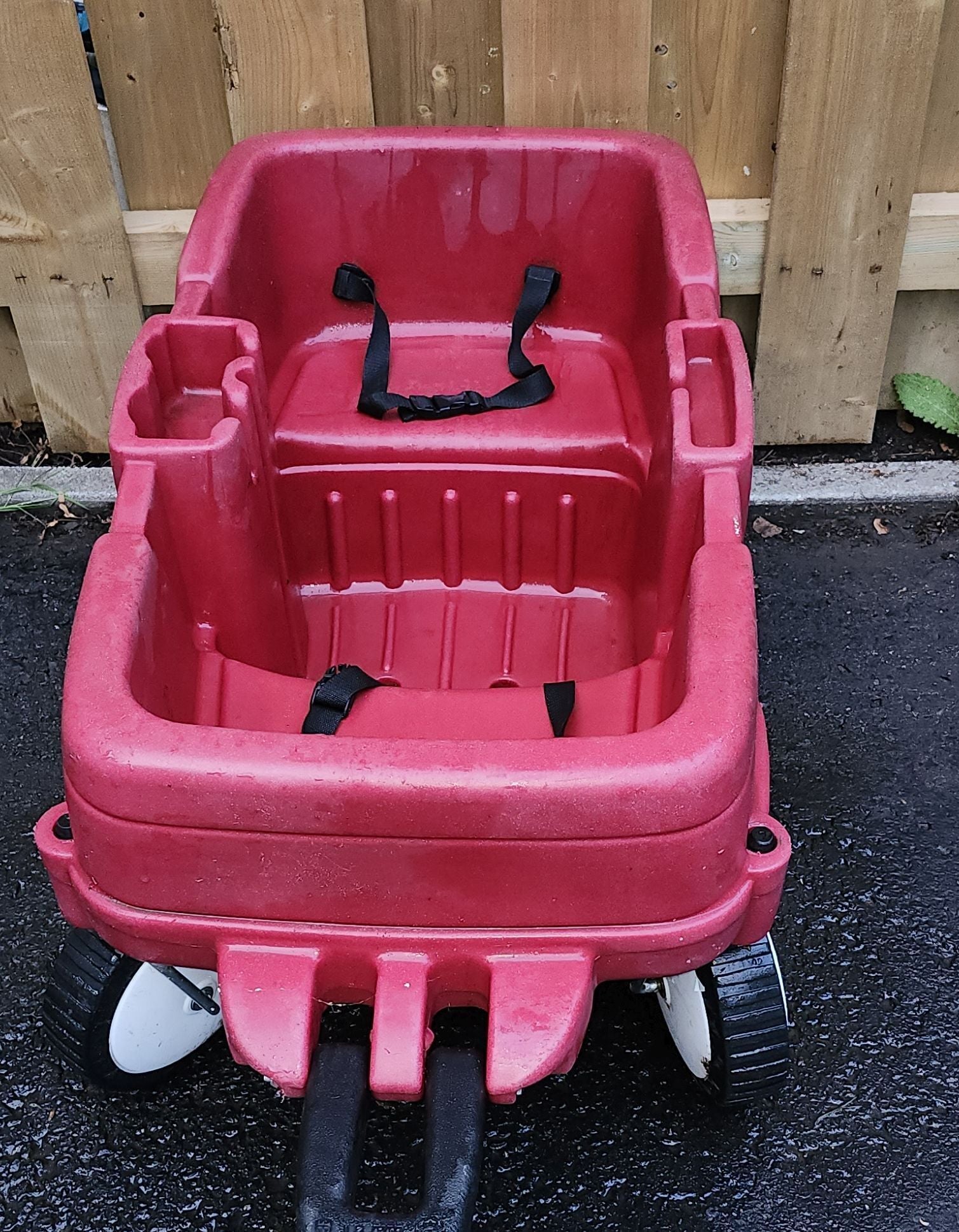 Wagon de marque Step2. Il y a 2 bancs et des attaches. Convient aux enfants entre 18 mois à 5 ans. Poids maximal de 75 lbs.