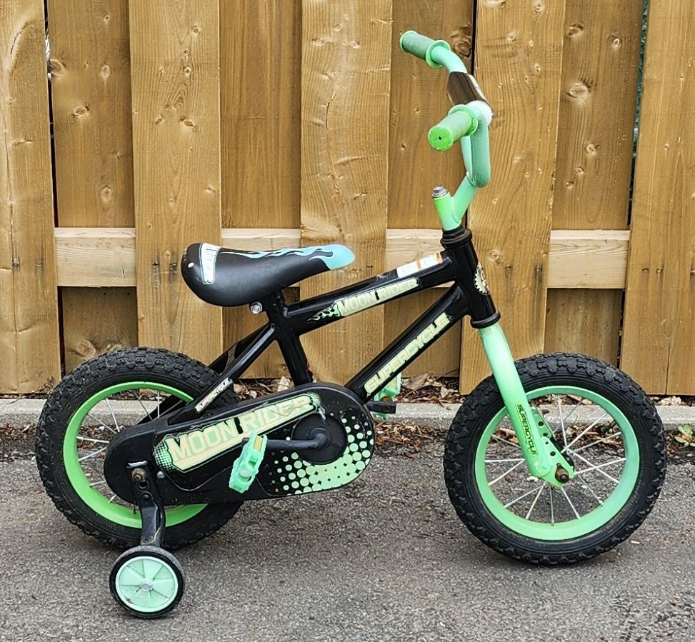 Vélo pour gars avec pneu de 12.5'' de marque Supercycle Moonrider avec petites roues. Conviens aux personnes mesurant 2' à 3'2'' . Mise au point effectuée pour cette saison.