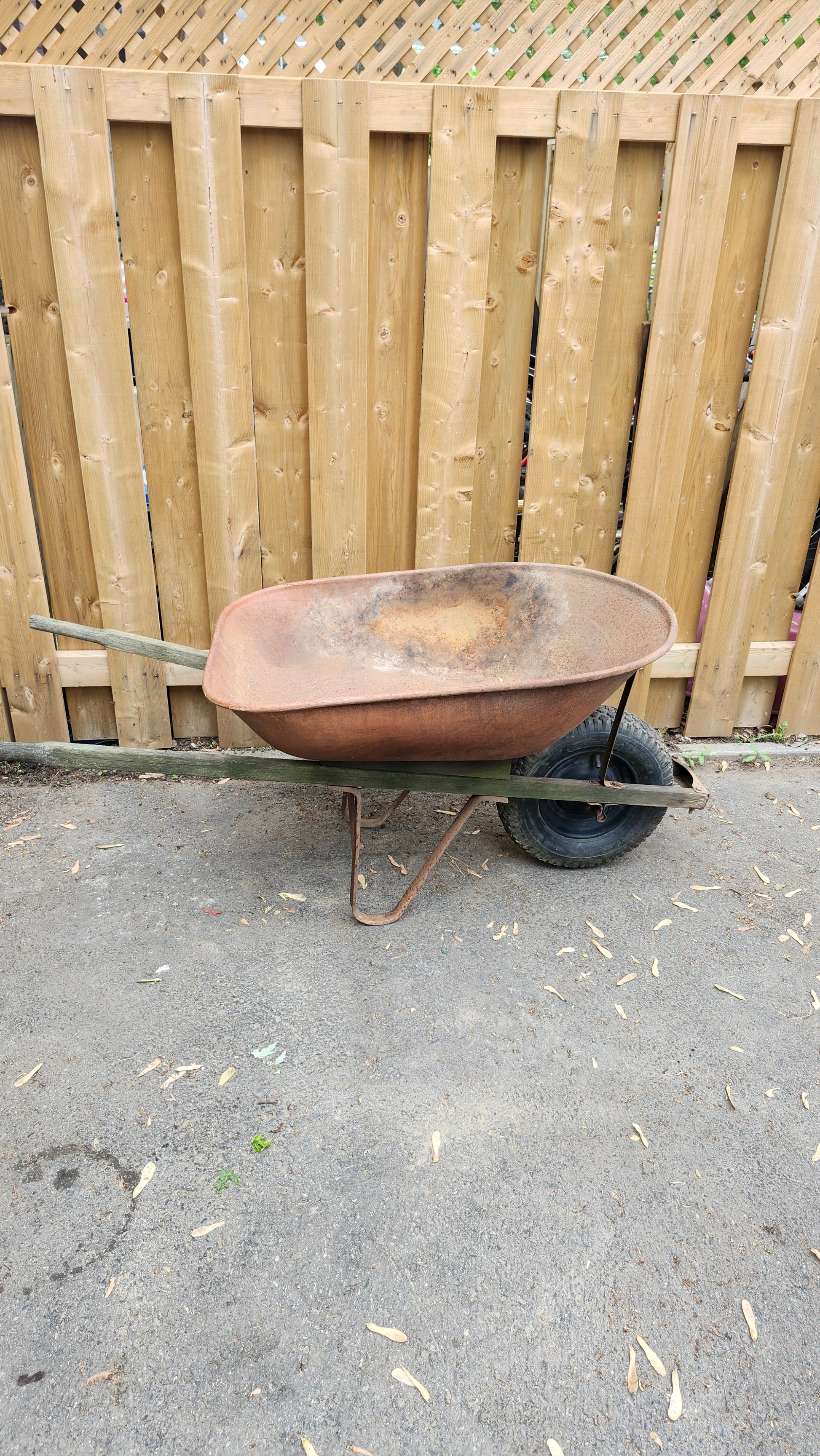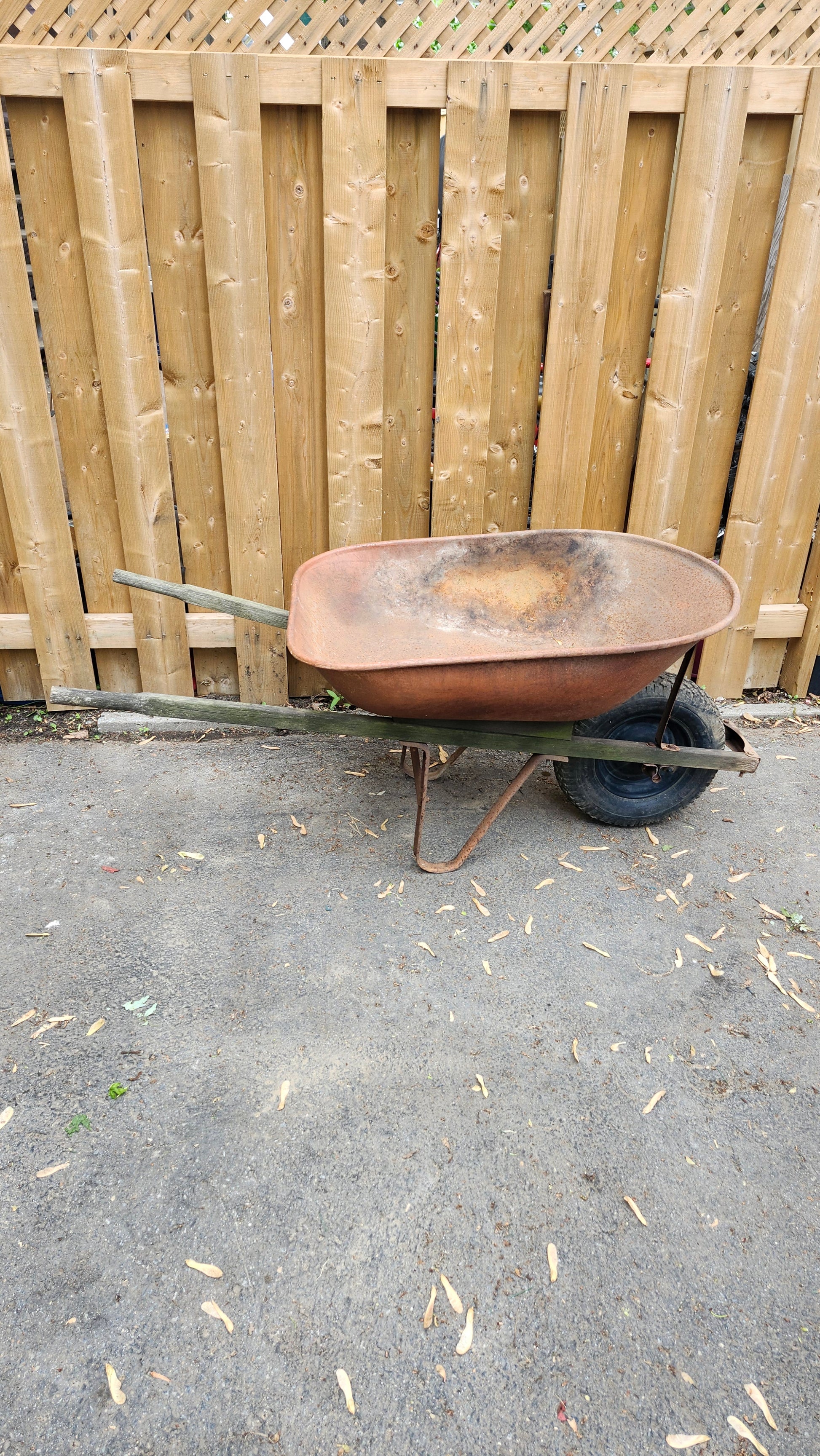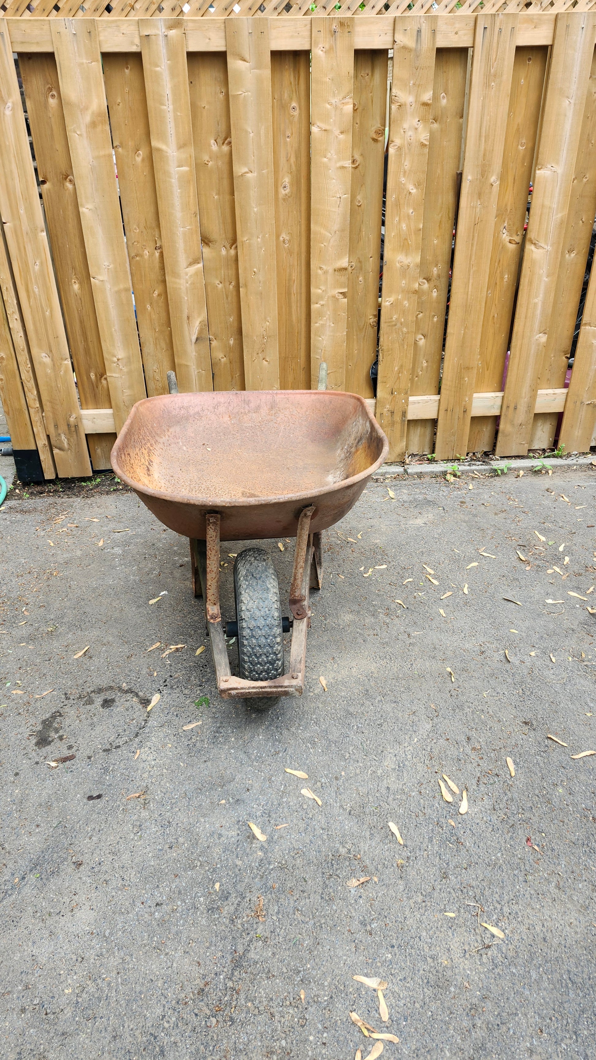 Brouette de jardin avec cuve en métal. Cuve d'environ 6 pied cube. Essieu de 5/8 et pneu de 16''.
