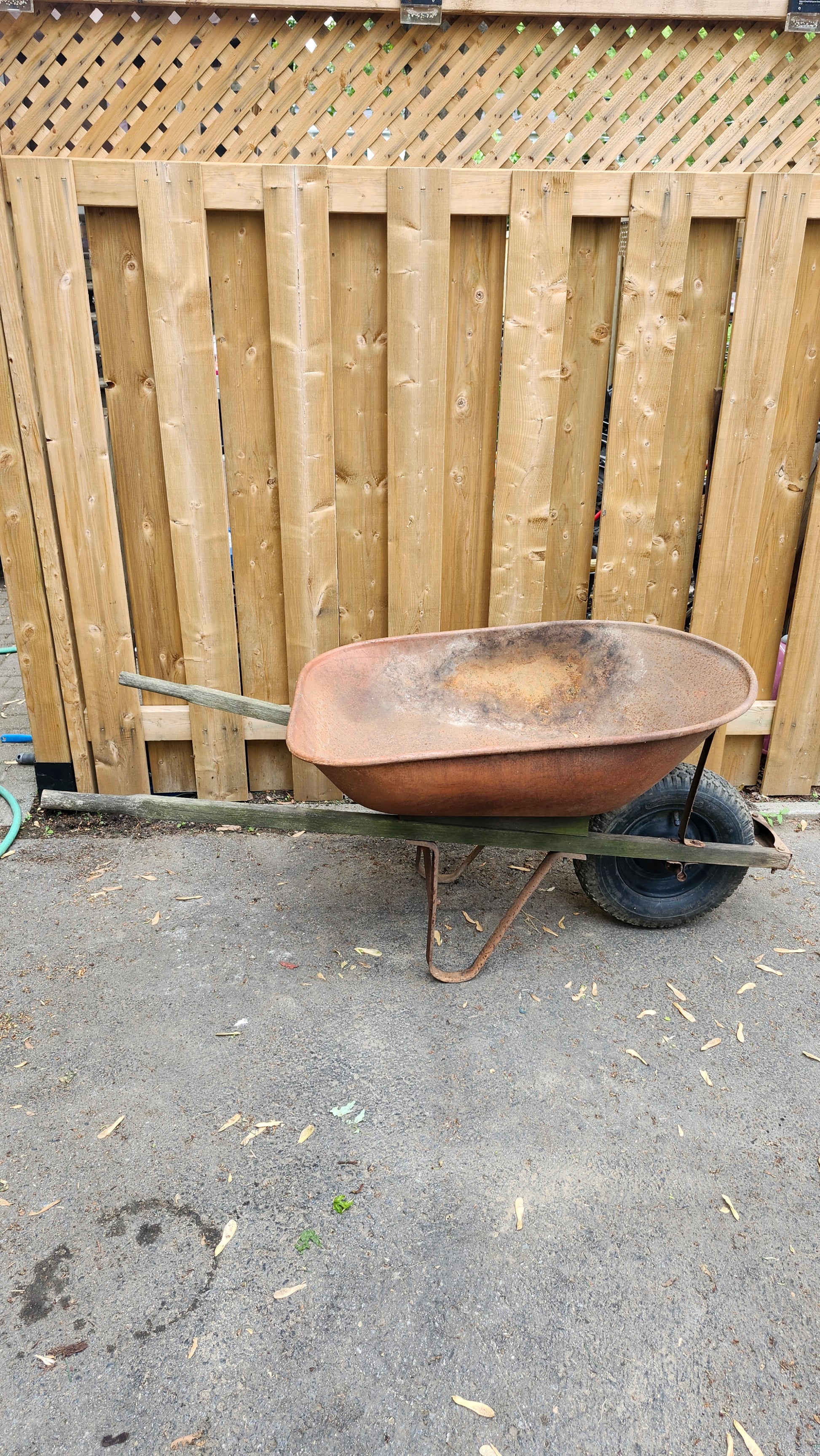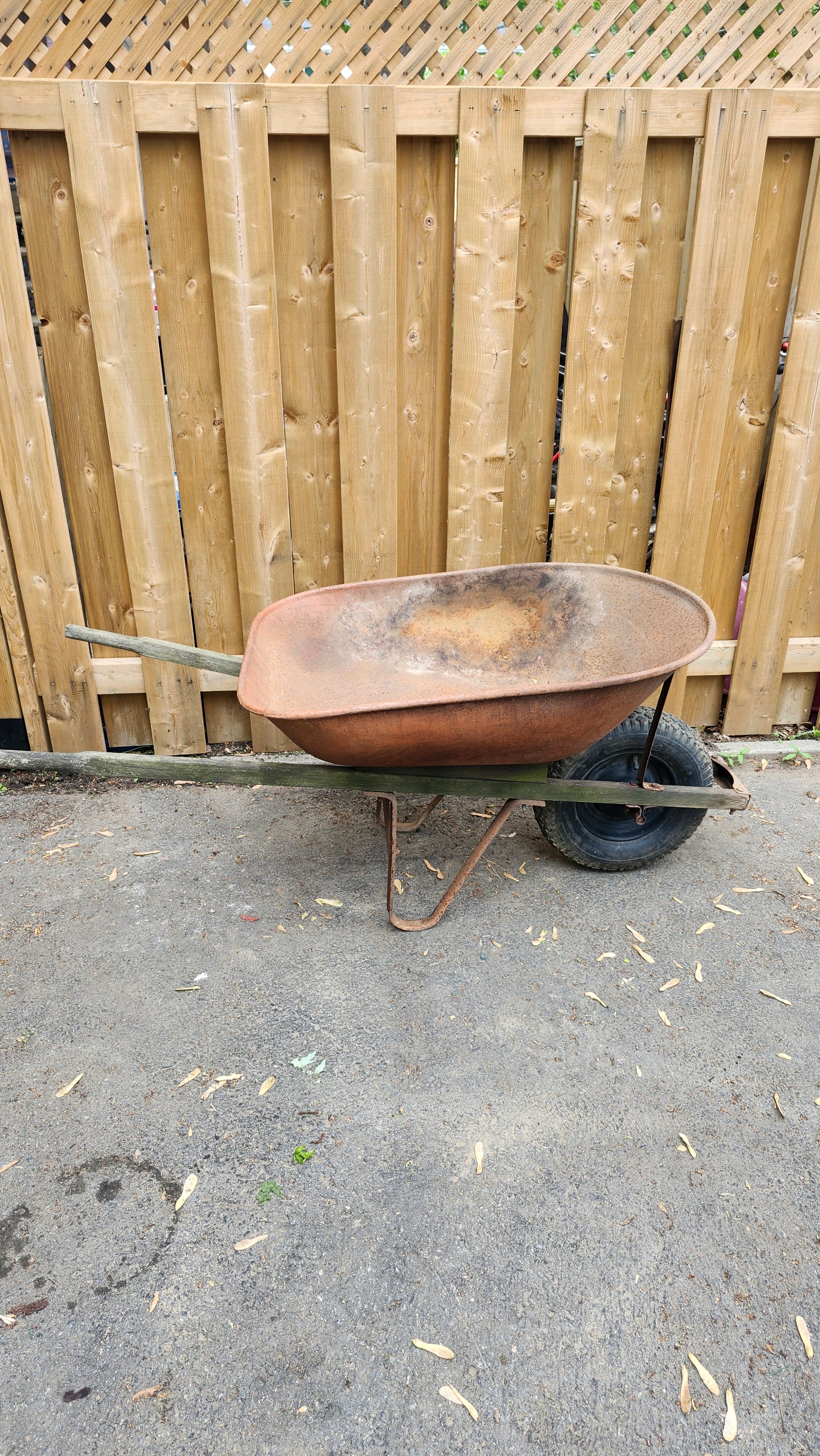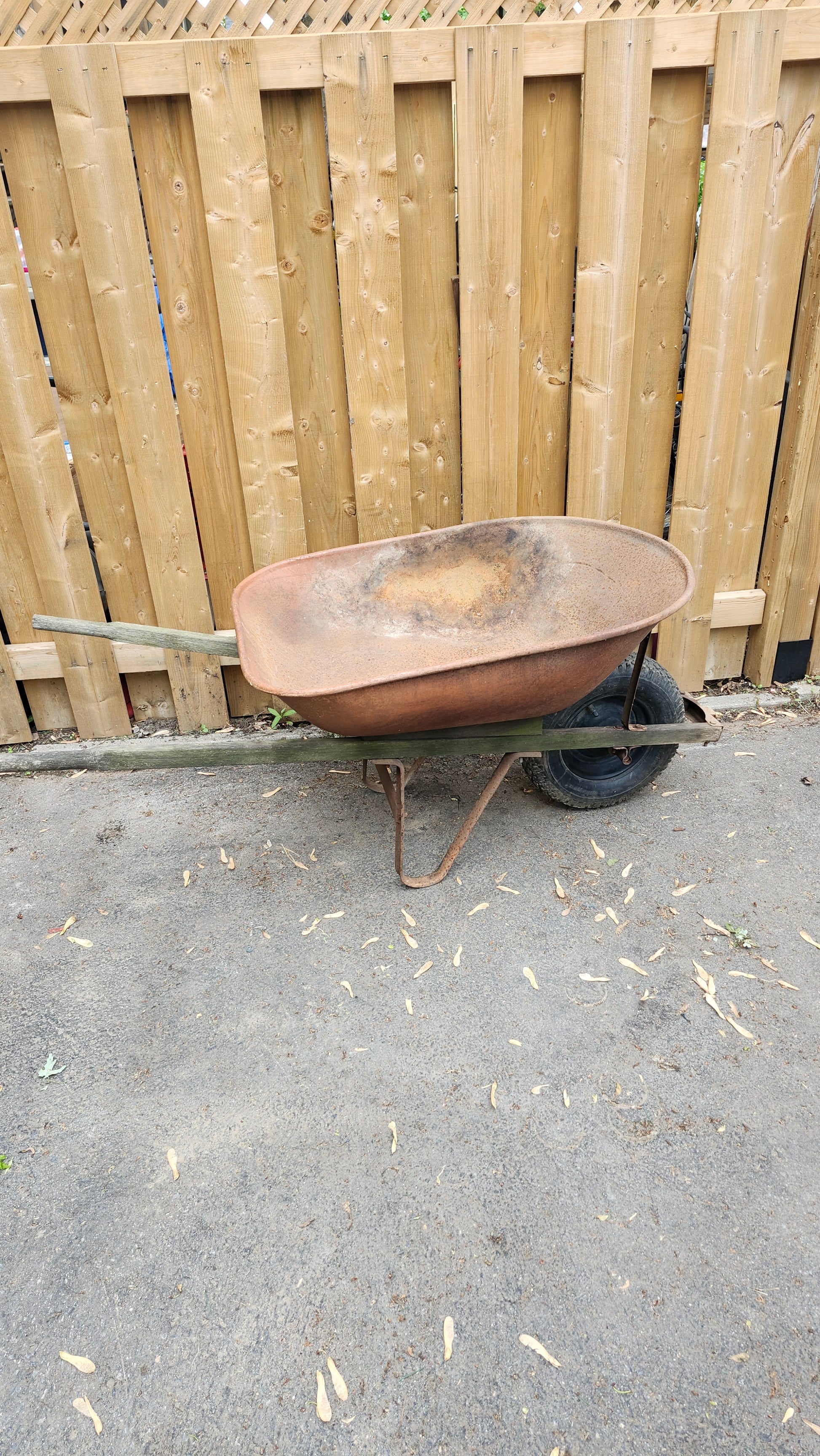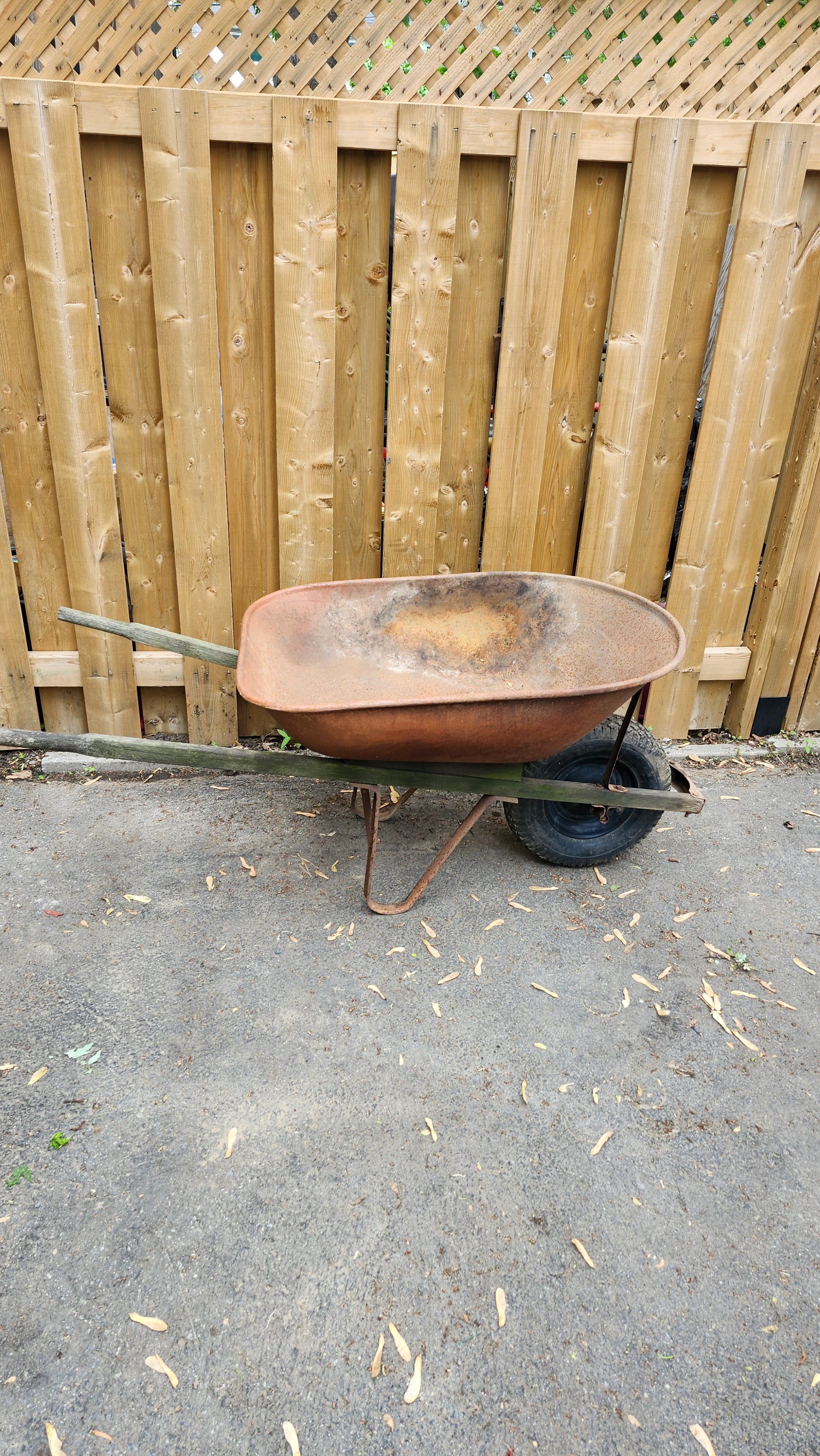 Brouette de jardin avec cuve en métal. Cuve d'environ 6 pied cube. Essieu de 5/8 et pneu de 16''.