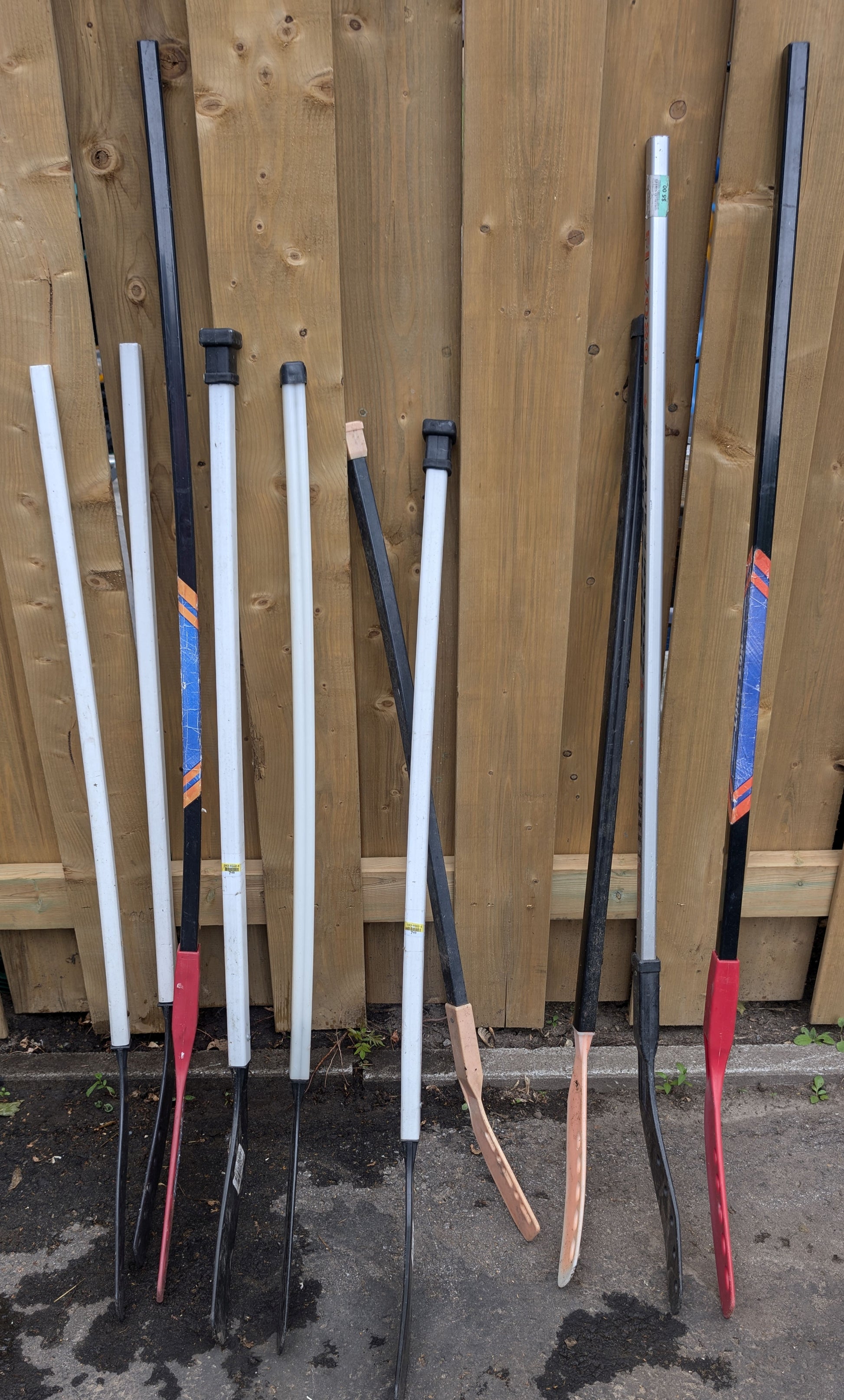 Lot de 10 bâtons de hockey en plastique. De grandeurs variées. Prix pour le lot